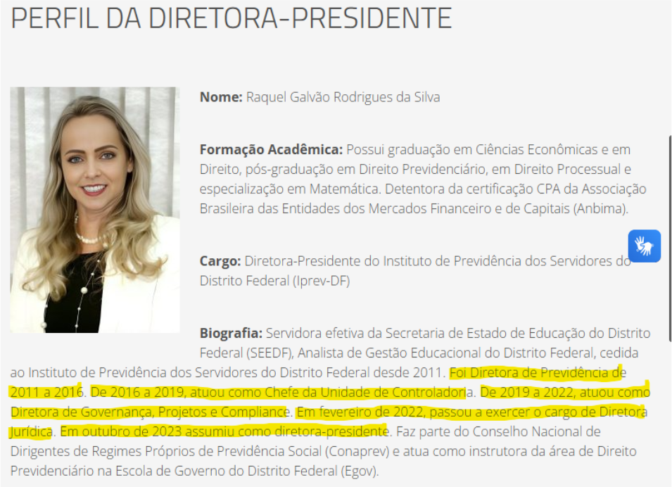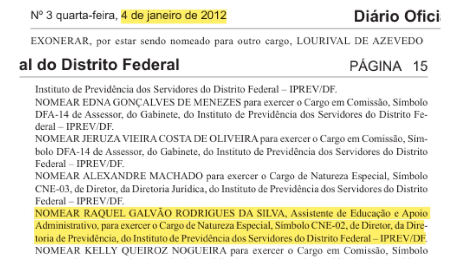 A cronologia é objetiva. Raquel Galvão foi nomeada para cargo de direção no IPREV em janeiro de 2012, assumindo funções decisórias diretamente ligadas à gestão previdenciária, dados atuariais, passivos do GDF e estratégias administrativas.