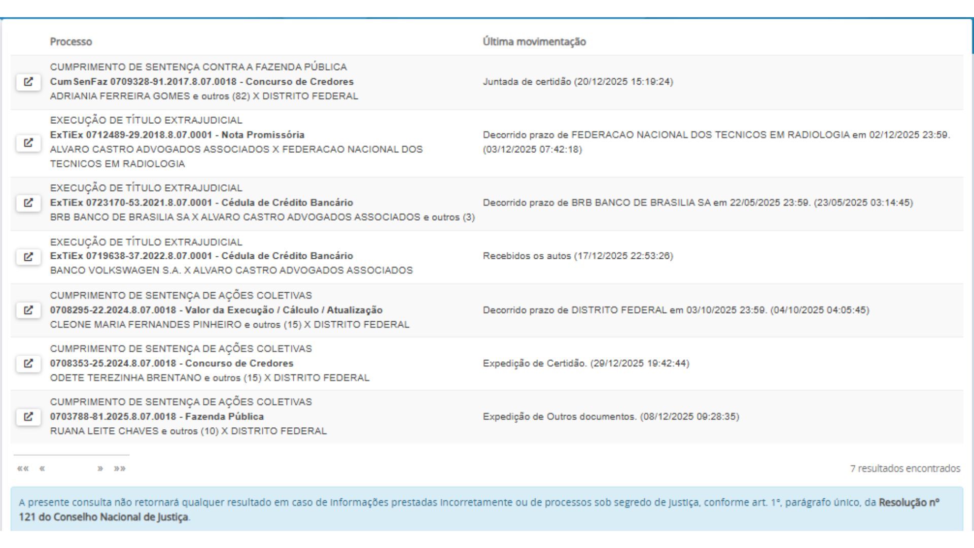 Não é atuação individual isolada. Pesquisas públicas no TJDFT revelam ações coletivas, execuções, cumprimentos de sentença e demandas previdenciárias, muitas delas envolvendo dezenas de substituídos por processo.