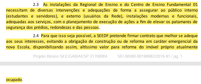 Trecho do Projeto Básico que deu início ao processo de locação do imóvel para o CEF 01 da Candangolândia.