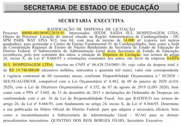 Ratificação da dispensa de licitação pela Secretaria de Estado de Educação do DF para locação de imóvel de 14.000 m² da empresa Saída Sul Hospedagem Ltda., no valor de R$ 19.740.000,00.