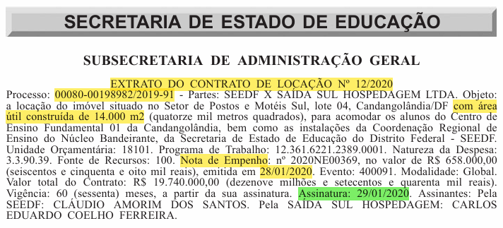 Extrato do Contrato de Locação nº 12/2020, firmado entre a Secretaria de Educação do DF e a empresa Saída Sul Hospedagem Ltda., para imóvel de 14.000 m² na Candangolândia, no valor total de R$ 19.740.000,00.