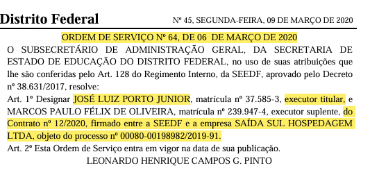 Ordem de Serviço nº 64, de 6 de março de 2020, designa José Luiz Porto Júnior como executor titular do Contrato nº 12/2020 firmado entre a Secretaria de Educação do DF e a empresa Saída Sul Hospedagem Ltda.