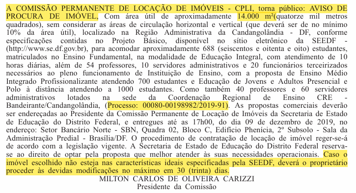 Dez dias depois, em 2 de dezembro de 2019, a Comissão Permanente de Locação de Imóveis (CPLI) publicou o Aviso de Procura de Imóvel, solicitando propostas para locação de prédio com aproximadamente 14.000 m² de área útil para acomodar os estudantes.