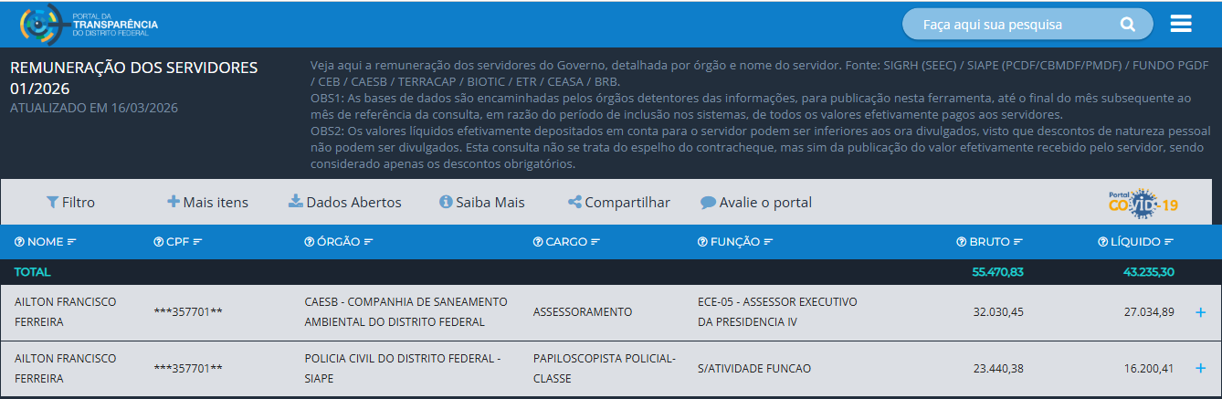 Em janeiro de 2026, Ailton Francisco Ferreira recebeu remuneração de R$ 55.470,83, valor acima do teto remuneratório do DF, fixado em R$ 41.845,49.