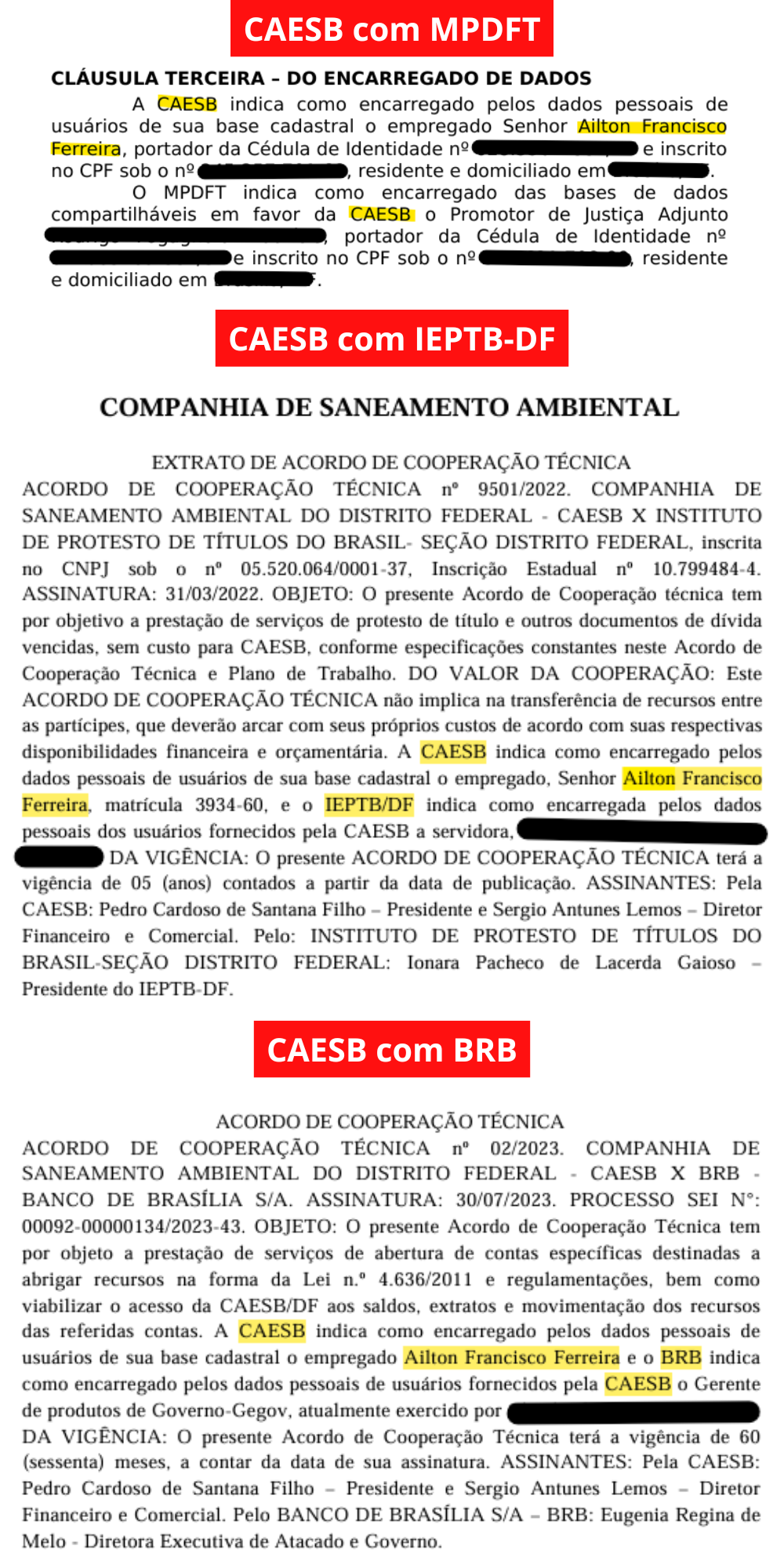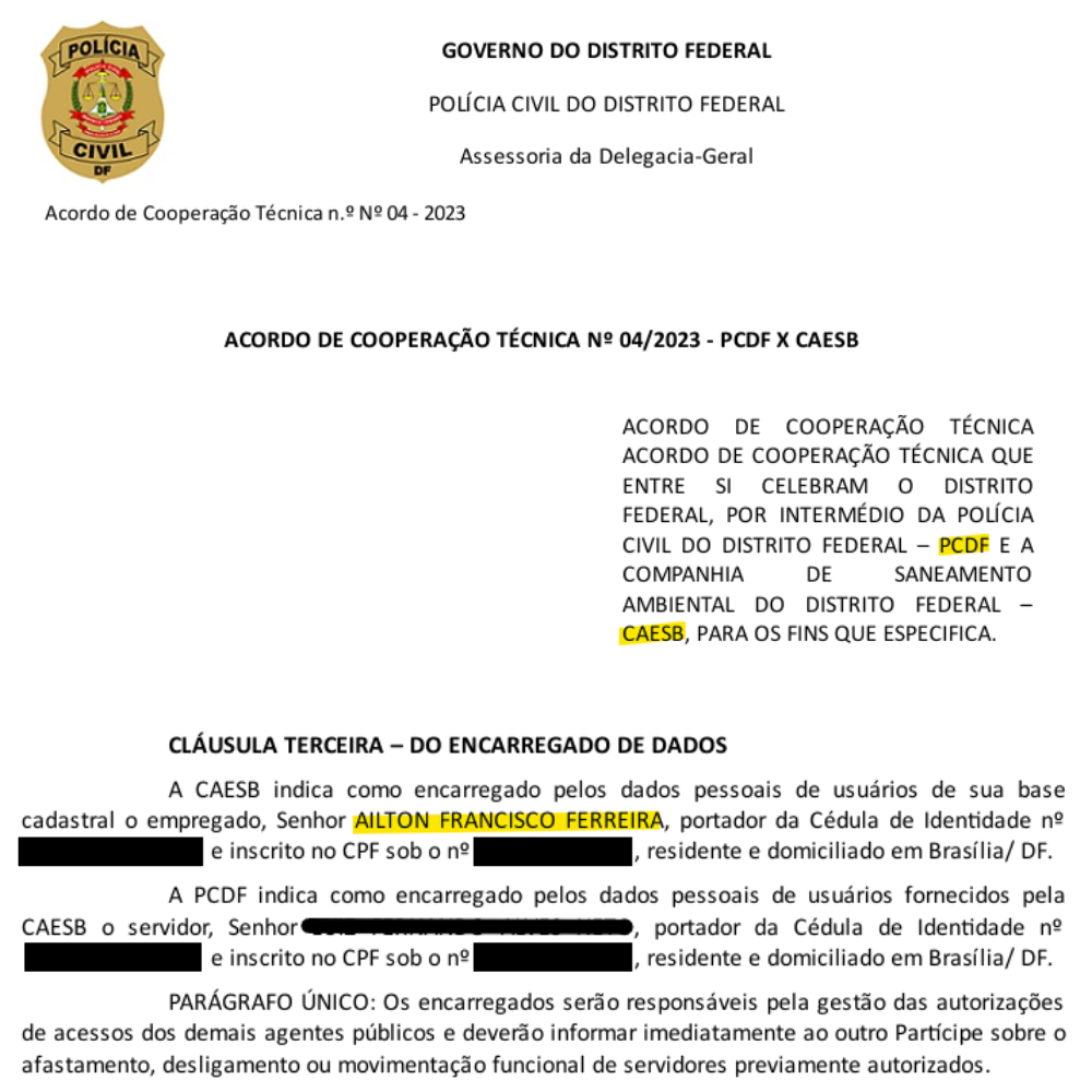 Em 19 de junho de 2023, já na CAESB, o policial civil aposentado foi designado pela companhia como encarregado pelos dados pessoais de usuários em um Acordo de Cooperação Técnica com a PCDF, o que ampliou ainda mais sua capacidade de obtenção de dados restritos e de circulação em sistemas sensíveis de informação.