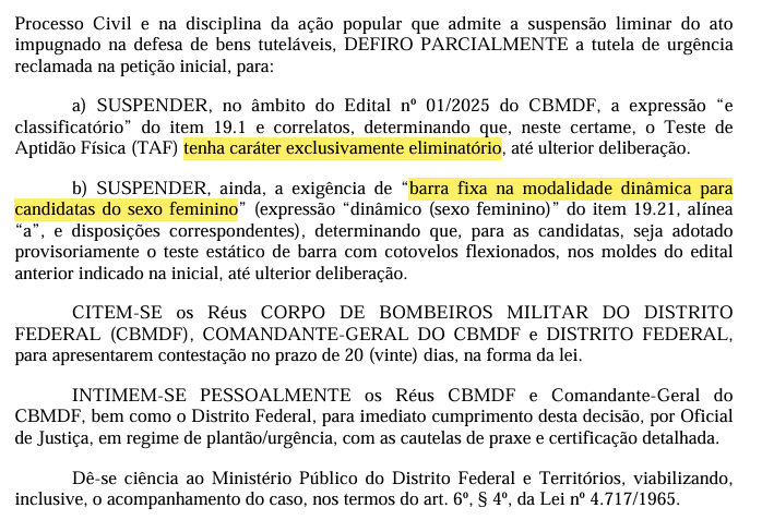 Em decisão liminar, o juiz Carlos Fernando Fecchio dos Santos, da 1ª Vara da Fazenda Pública do DF, determinou a suspensão de dois pontos centrais do TAF previsto no edital nº 01/2025: o caráter classificatório do teste físico e a exigência de barra dinâmica para candidatas mulheres.
