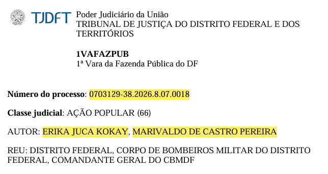 Ação Popular nº 0703129-38.2026.8.07.0018 foi proposta pela deputada federal Erika Kokay e pelo advogado Marivaldo de Castro Pereira contra o Distrito Federal e o CBMDF.