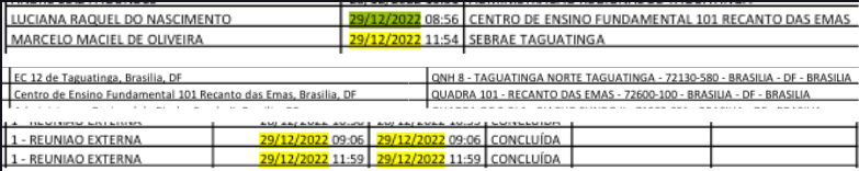 A primeira corrida foi registrada às 08h56, solicitada por Luciana Raquel do Nascimento. O deslocamento teve origem no Centro de Ensino Fundamental 101, no Recanto das Emas, com destino à EC 12 de Taguatinga Norte (QNH 8). No sistema, a justificativa inserida foi “reunião externa”, com chegada registrada às 09h06.
