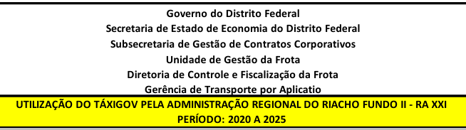 Tabela oficial da Secretaria de Economia do DF registra a utilização do TáxiGov pela Administração Regional do Riacho Fundo II (RA XXI) no período de 2020 a 2025.