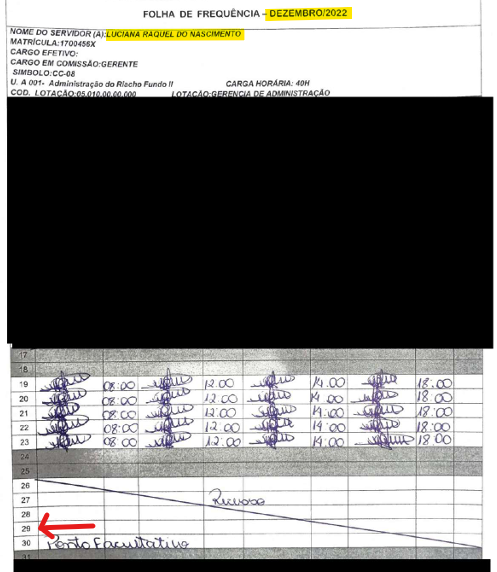 O detalhe é que, segundo a folha de frequência da época, Luciana estava formalmente em período de recesso naquela data — o que levanta dúvidas sobre a compatibilidade entre os registros funcionais e o uso de um serviço destinado exclusivamente a atividades oficiais.