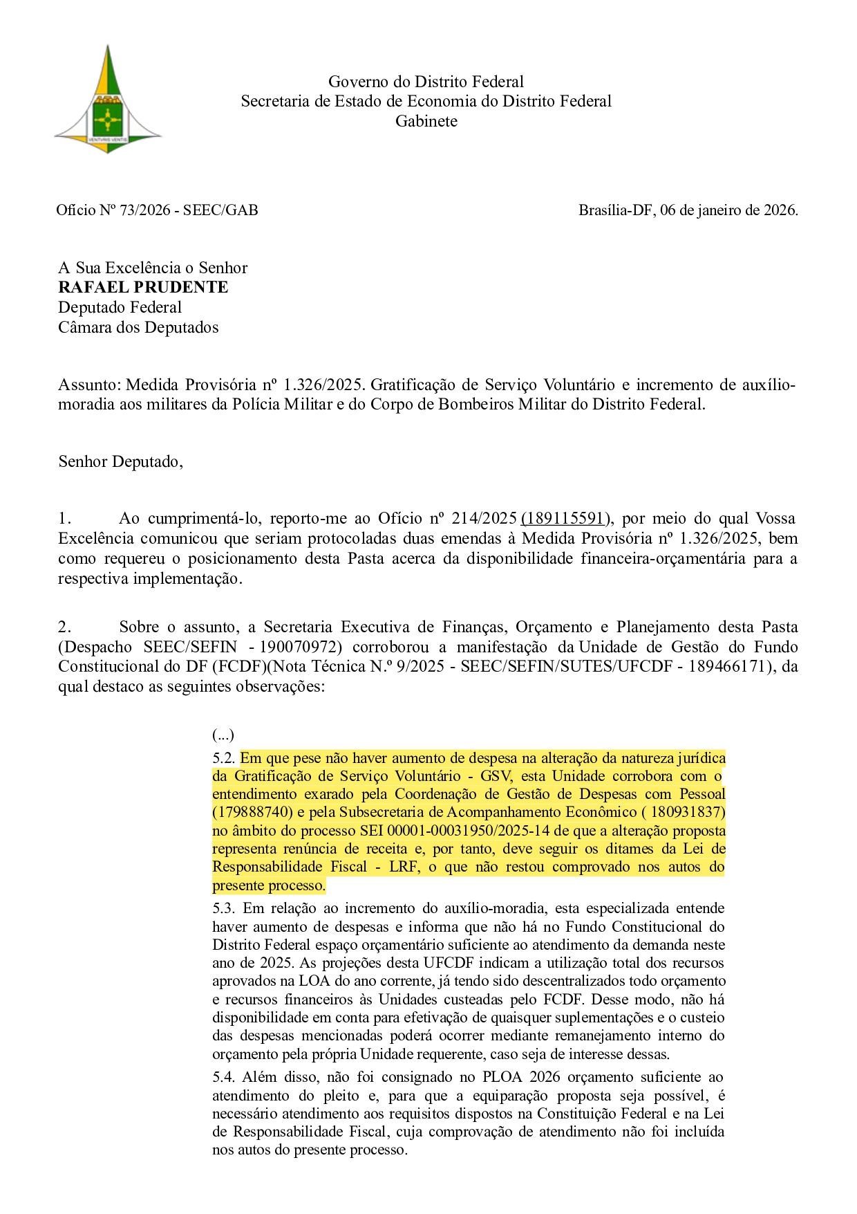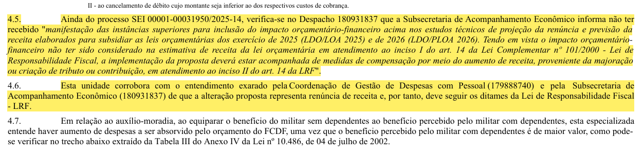 Em resposta oficial enviada ao parlamentar, o Governo do Distrito Federal, por meio da Secretaria de Economia, afirmou não concordar com a mudança e sustentou que a reclassificação do SVG como verba indenizatória configuraria “renúncia de receita” e, por isso, dependeria de estimativa de impacto e medidas de compensação previstas na Lei de Responsabilidade Fiscal.