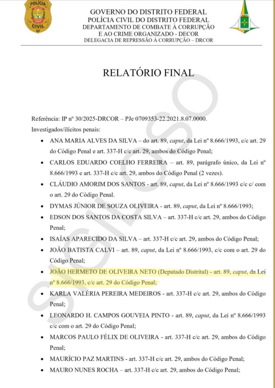 O deputado distrital João Hermeto de Oliveira Neto, e líder do governo Ibaneis na Câmara Legislativa do Distrito Federal (CLDF), aparece como investigado no relatório final da Polícia Civil do DF, acusado de participação em esquema que envolve o desvio de R$ 46 milhões da educação pública.